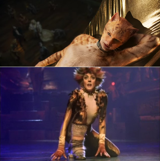 The character in both images are of Bombalurina singing a ballad. Top: A screenshot of the movie Cats (2019) from Universal Pictures. Below: A screenshot of the play Cats (1998)