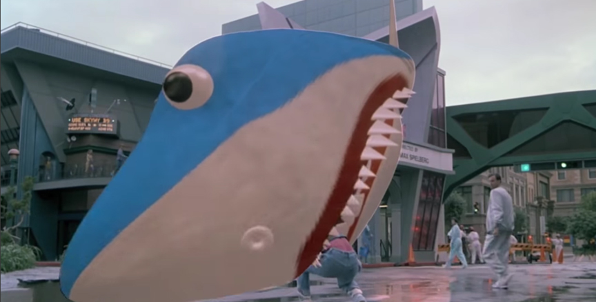 A screenshot of Universal’s Back To The Future: Part Two (1985) with Marty McFly in front of an interactive advertisement of JAWS 19.