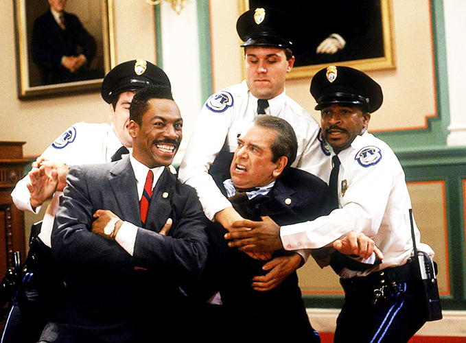 Dick Dodges (Lane Smith) being dragged off by security with Thomas Jefferson Johnson (Eddie Murphy) smiling in front of them.