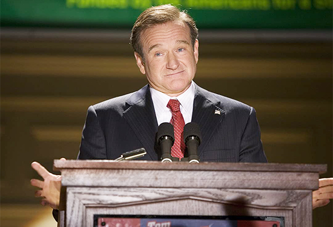 Tom Dobbs (Robin WIlliams) on a podium.