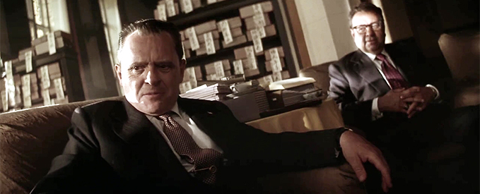 Screenshot of Hollywood Pictures – Nixon (1995). President Richard Nixon (Anthony Hopkins) in a chair with Henry Kissinger behind him (Paul Sorvino).