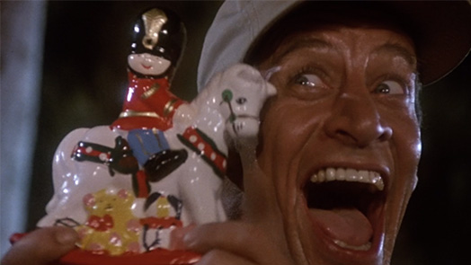 Screenshot of Ernest Saves Christmas. Ernest holding a Christmas toy happily.