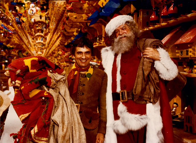 Screen shot of Santa Claus: The Movie (1985). The elf and Santa Claus laughing.