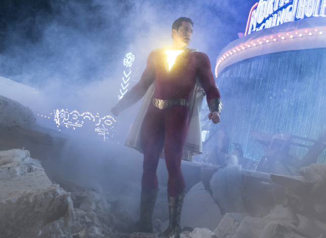 Screen shot of Shazam! (2019). Shazam lands in an amusement park.