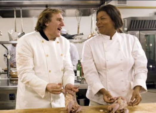Screen shot of Last Holiday (2006). Georgia and Chef Didier prepare chicken in the hotel kitchen.