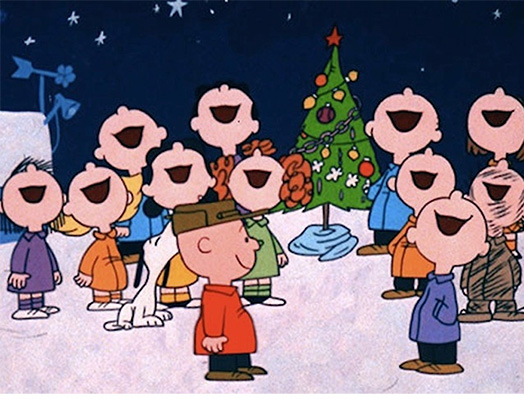 Screen shot of A Charlie Brown Christmas (1965). The Peanuts gang singing “Hark the Herald Angels Sing.”