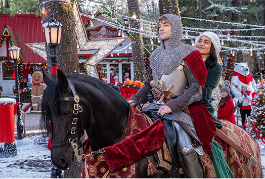 Screen shot of Knight Before Christmas (2019). The knight riding a horse with his belle.
