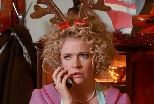 Screen shot of Holiday in Handcuffs (2007). The waitress in antlers on the phone.