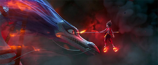 Screenshot of Ne Zha (2019). Ne Zha transformed into his final form facing down the sea dragon.