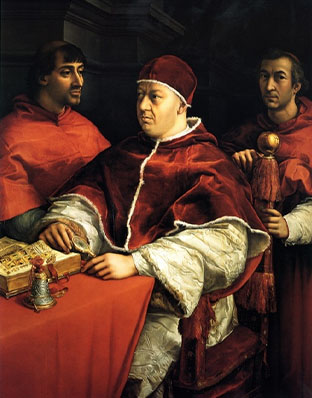Painting of “Portrait of Pope Leo X with two Cardinals”, c. 1518-1520, Oil on Wood, Raphael, Uffizi, Florence – Source: Public Domain.