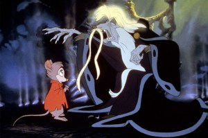 Screenshot of Don Bluth’s The Secret of NIMH (1982). Mrs. Brisby talking to Nicodemus, the old prophet rat.