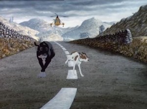 Screenshot of MGM/UA’s Plague Dogs (1982). The two dogs are running away from a helicopter.
