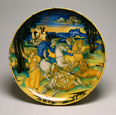 Maiolica Plate of the Lion Hunt by Painter Baldassare Manara in c.1520 to 1547.