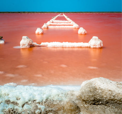 Photo of the Galerazamba pink sea with built-up salt deposits. Source: Photo by Emmanuelsq at Dreamstime