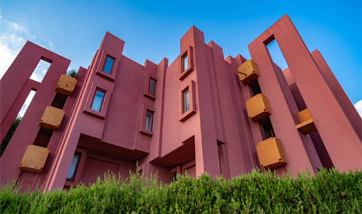 It’s a postmodern apartment complex in Manzanera, Calpe, Spain designed by world-renowned architect, Ricardo Bofill, in 1968. It’s formed like a fortress with many stairs and high walls. “La Muralla Roja” translates to “The Red Wall.” The architecture has influences of Arab Mediterranean adobe towers in North Africa. The outside was painted various tones of reds to accentuate the contrast with the landscape. It also has various hues of blues and violets to work with the stronger and weaker contracts from the sky. Together they make an optical effect for the illusion of space.