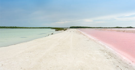 A large pink lake in Yucatan Peninsula, Mexico. The region is a part of a protected wetland with crocodiles, flamingos, sea turtles, jaguars and other sea birds. The water is pink because of red-coloured algae, plankton and brine shrimp which like the high salt content. The lake is used for fishing and sea salt harvesting which dates back to the days of Mayans collecting salt from shallow lagoons from nearby floods.