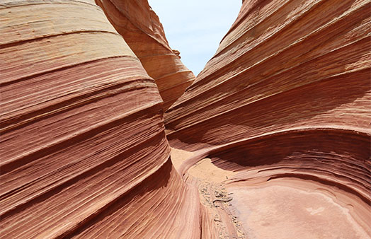 These are sandstone formations in Arizona near Coyote Buttes, north of the Utah-Arizona border. Only a few people can visit the park at a time due to the fragility of the sand formations. The Wave forms a U-shaped trough that eroded into Navajo Sandstones in the Jurassic era. There are dinosaur tracks, a boneyard, rock formations unique to the area.