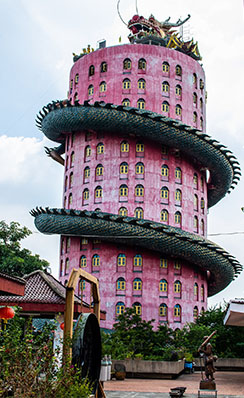 It’s a 17-story pink cylindrical superstructure with a bearded red and green dragon wrapped around the building. The name of this building is Wat Samphran. The building is in Amphoe Sam Phran, Thailand. It’s a large Buddist temple built-in 1985. The building is a combination of Chinese beliefs (the dragon [Mangkorn] and Thai culture and beliefs by the local monks. The dragon is built out of iron and fibreglass.