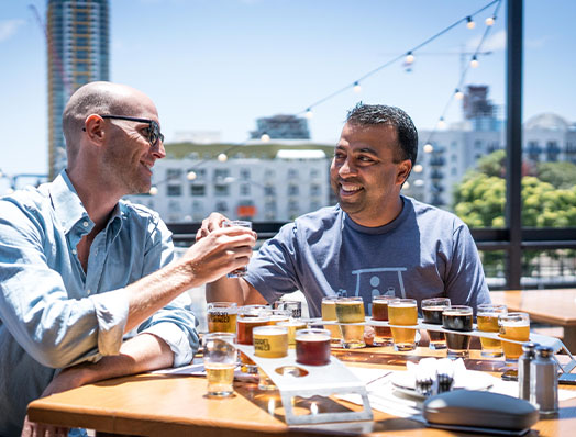 Two men at a restaurant tasting various beers and ales. Photo by Elevate on Pexels.