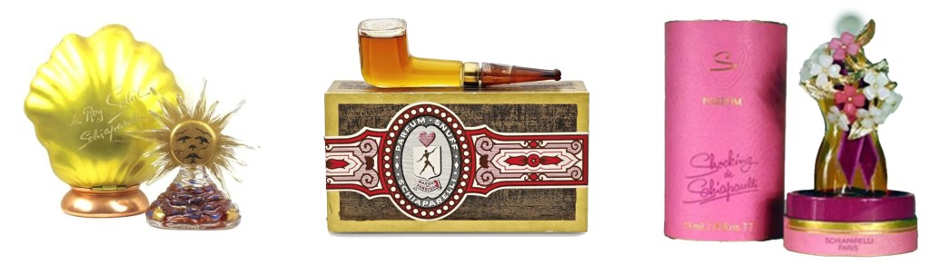 Photos of the Dada and avant-garde sculpted perfume bottles. Left to right: Dali’s Le Roy Soleil, Cocteau’s Snuff and Schiaparelli’s Shocking de Schiaparelli