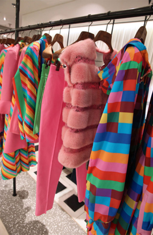 The colour was featured in many of her designs but in 1937 for the perfume Shocking de Schiaparelli the name Shocking Pink stuck. The perfume bottle shape was sculpted by Leonor Fini to have a voluptuous female torso and Dalí-esque flowers for a head and a velvet measuring tape with the bottle encased in a hot pink case. The bottle shape was inspired by Mae West’s figure. She designed gowns for West in the film Every Day is a Holiday in 1937 and took inspiration from her torso silhouette. The colour was used to express playfulness, exuberance, confrontational attitude and surrealness.