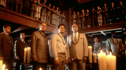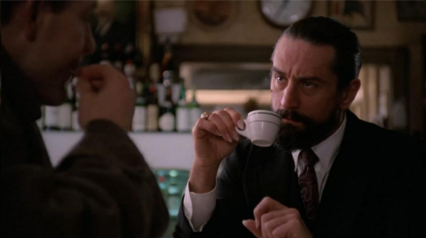 Screenshot of Angel Heart (1987). Detective Harry Angel is at a meeting with Louis Cyphre.