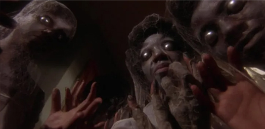 A blaxploitation film about Diana “Sugar” Hill a photographer dating the nightclub owner whose murdered by the mob when he refused to sell his club. She seeks help from a former voodoo queen to avenge her boyfriend’s death by summoning the voodoo lord of the dead, Baron Samedi, who enlists his army of zombies. The zombies have an alien-like appearance with silver balls attached to their eyes and painted muscle tone on top of the grey paint and cobwebs to their bodies.