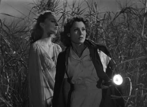 Screenshot of I Walked With A Zombie (1943). Jessica is walking in a trance through the field with Nurse Betsy.