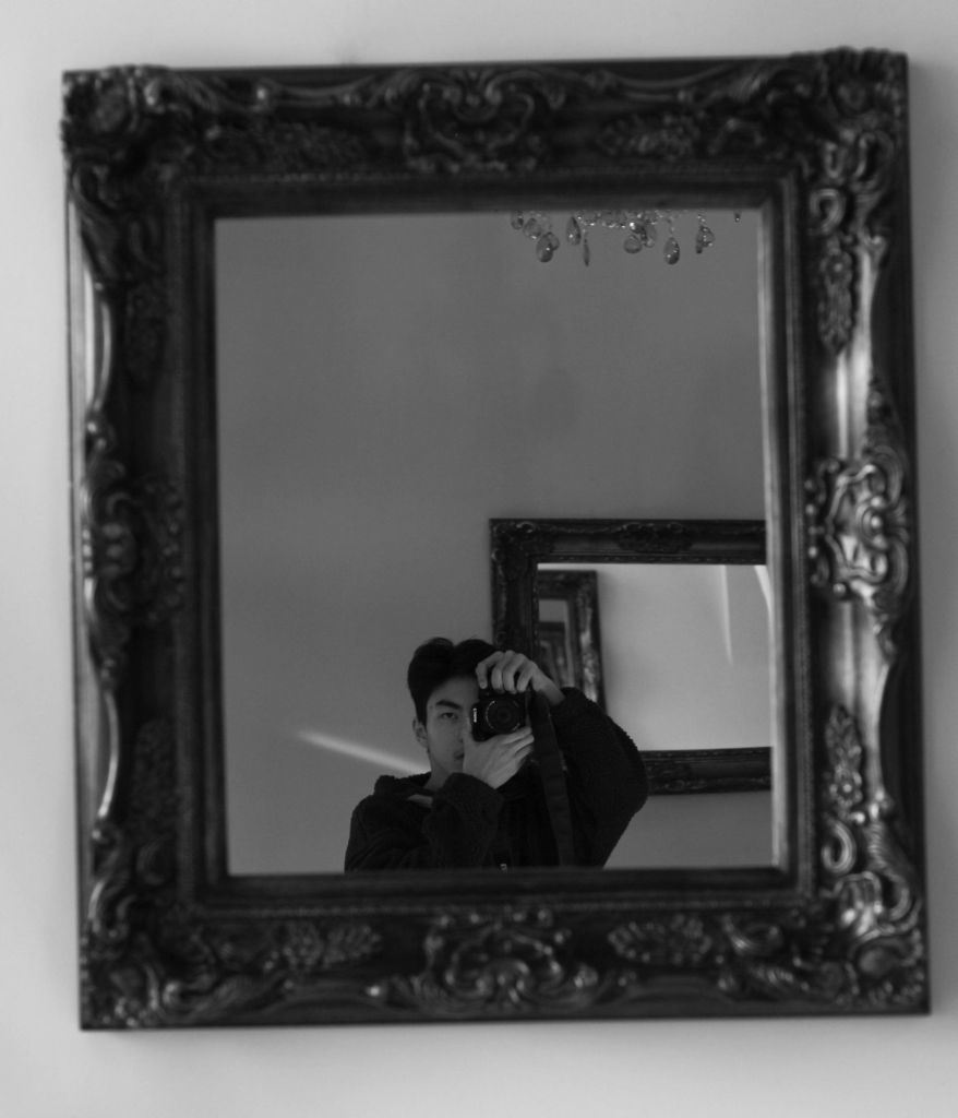 Cropped image of Man in black and white long sleeve shirt taking selfie in front of mirror Chingiz Abdullin on Unsplash.